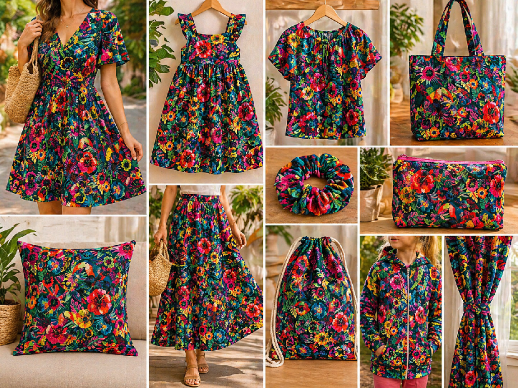 Tato jemná bavlněná látka zaujme na první pohled svým výrazným tropickým designem plným exotických květů, listů a tukanů. Bohatá paleta barev na tmavším podkladu vytváří živý a energický vzor, který je ideální pro letní a kreativní projekty.